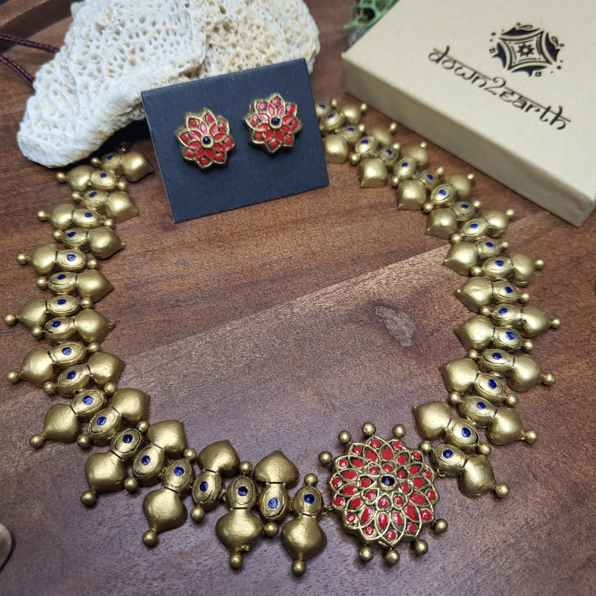 This handcrafted terracotta choker features a rich gold-tone base with subtle navy blue highlights and a bold red central pendant inspired by traditional jadau artistry. Amulya, meaning priceless, comes with matching studs and bridges the gap between ethnic charm and contemporary flair.