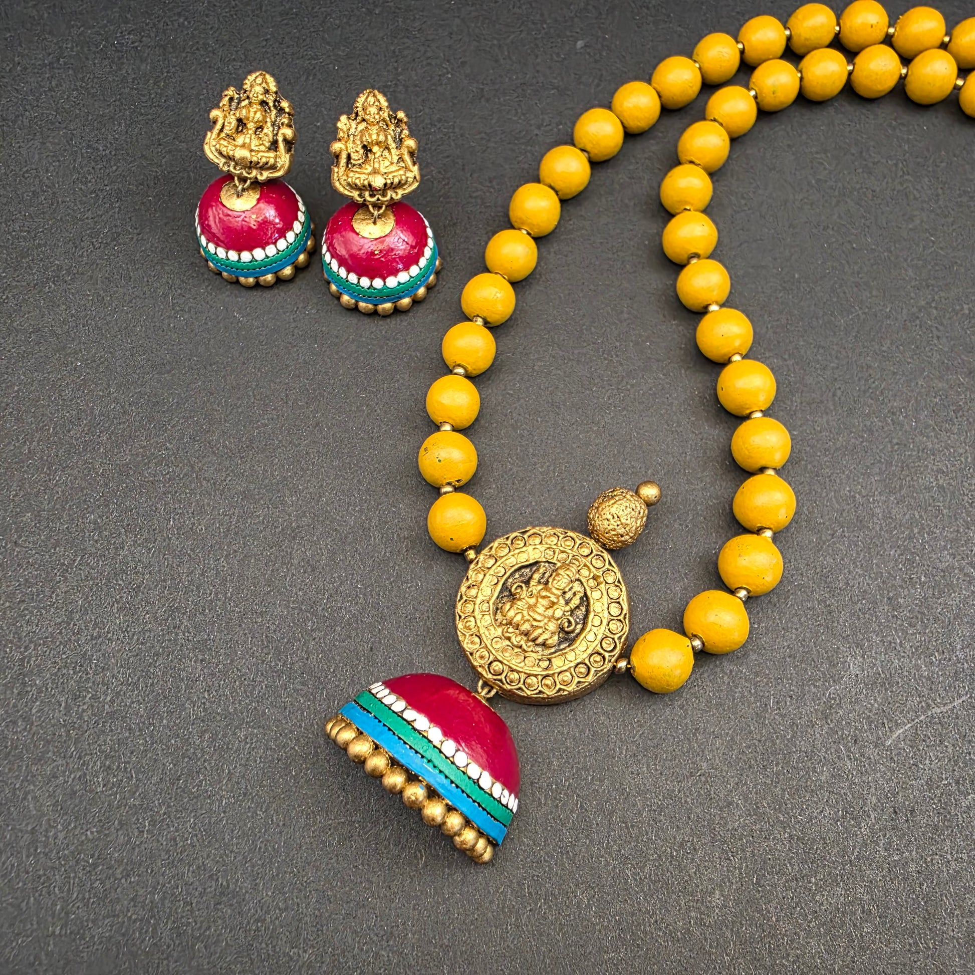 This lightweight terracotta set features colorful beads leading to a Lakshmi pendant adorned with a dangling jhumka at the bottom. Available in two joyful combinations — green & pink and yellow & red — it’s versatile, fun, and perfect for teens and younger kids too.