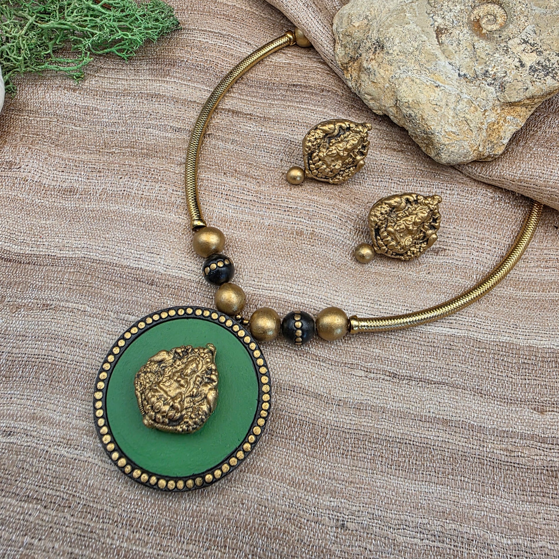 These terracotta sets feature a light, hasli-style necklace with a Lakshmi pendant, paired with matching Lakshmi studs with a dangling bead. Versatile and easy to wear, it’s perfect for teens, young girls, and anyone who loves subtle elegance.