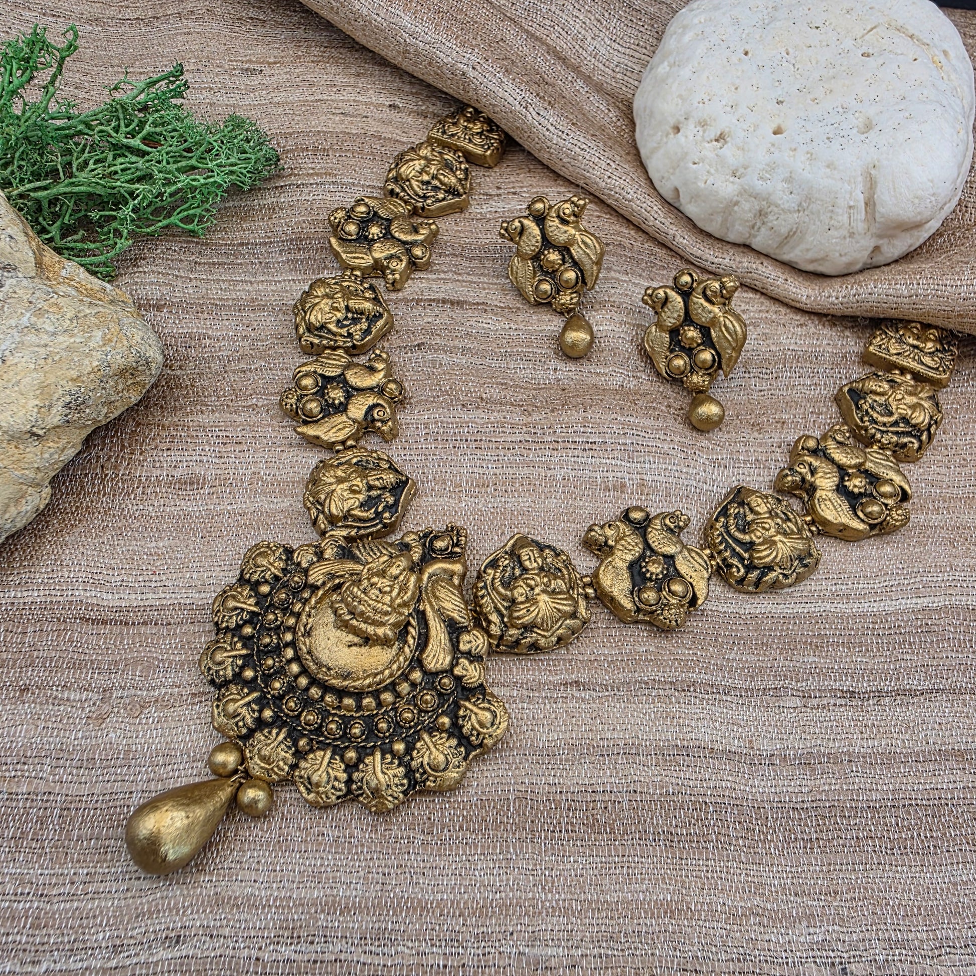 This all–antique gold tone terracotta set features alternating twin peacock and Lakshmi motifs, leading to a stunning central Lakshmi pendant that embodies abundance and devotion. The matching stud earrings with a dangling bead complete the look, adding a touch of regal charm.